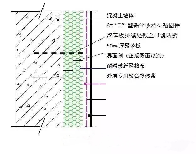 保溫板外側低碳鋼絲網片均按樓層層高斷開,互不連接。沿板拼縫方向每600mm用150×150“U”型8#鉛絲穿過縫兩側保溫板同墻內鋼筋綁扎牢固。