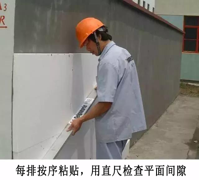 2、考慮到在粘結劑未干前保溫板沒有足夠的承載力,因此苯板的鋪貼順序應該從下往上進行施工,鋪貼時還必須采用靠尺進行施工,以保證平整度要求。 3、板的排列:要求自墻面底部起橫排布板,逐塊粘貼,每排按順序依次粘貼,排與排之間錯縫粘貼,外轉角也應錯縫。每一排的板與板間接縫要錯開1/2板長,苯板最小長度應保證在200㎜以上(包括200㎜)。所有保溫板之間的縫隙不能超過1.5mm。