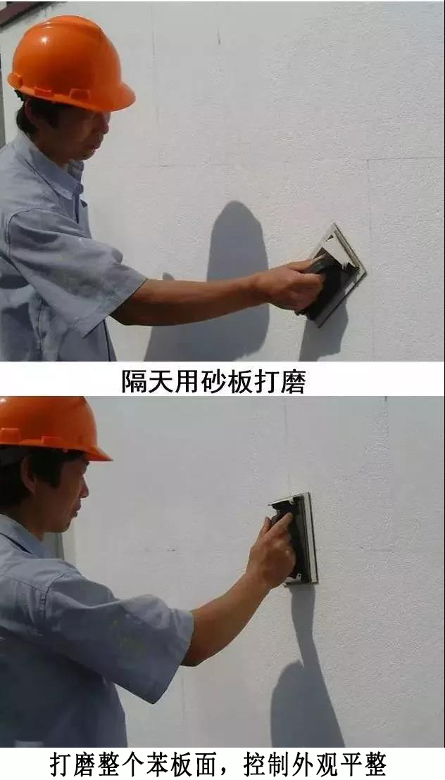 6、打磨:在苯板鋪貼完畢后,間隔24小時進行打磨。 用美工刀割去凸出于墻面部分,然后用打磨板磨去板縫處的不平整;使用2米以上靠尺進行檢查,使整個保溫墻面的平整度不超過4mm/2m。打磨時散落的聚苯板屑應隨時用刷子、掃把或壓縮空氣清理干凈。