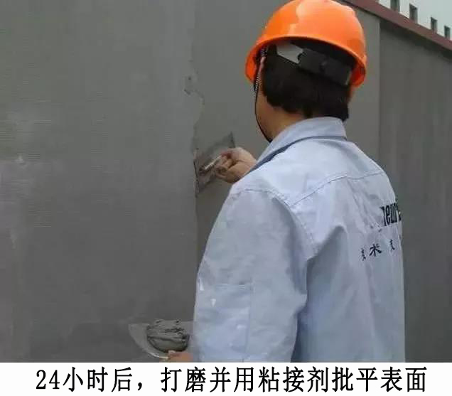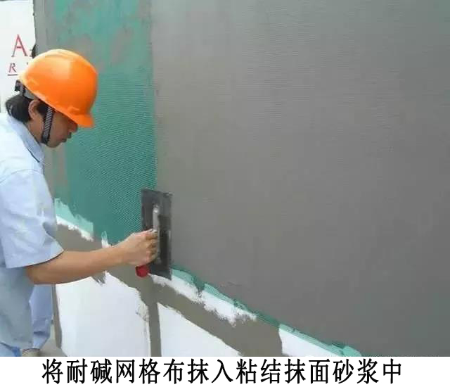2、將整個墻面使用粘結抹面砂漿進行滿批打底。 3、在粘結抹面砂漿沒有凝固之前將耐堿網格布抹入粘結抹面砂漿中