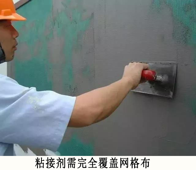 4、粘結抹面砂漿應充分的把網格布包裹,但網格布應盡量靠近加固層的表面約2/3處。具體以看不見網格布顏色而看得見網格布格子的標準來控制施工質量(意思就是網格布外層的粘接劑越少越好,壓入網格布或外層的粘接劑上完后用2米刮刀在外表面刮平整既可)。此工序強調相互配合,一氣呵成。