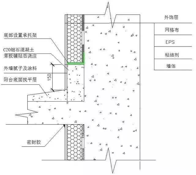 十二、陽臺欄桿橫桿固定處示意圖 鐵藝欄桿在保溫板粘貼前,將預埋件固定在墻上,欄桿焊接好,由保溫修補。