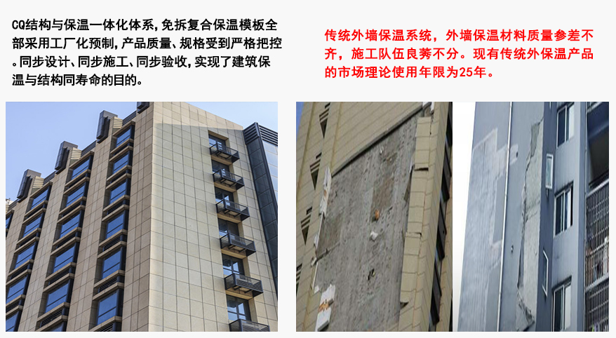 CQ免拆模板的出現打破了以往傳統建筑外墻保溫易脫落、開裂,防火保溫無法同步的問題,該模板通過實施節能結構一體化技術,實現了建筑保溫二次施工想同步施工的轉變,建筑材料防火向建筑結構防火的額轉變,建筑保溫全壽命周期向與墻體結構同壽命轉變,有效避免了外墻外保溫技術的工程質量和消防安全問題的發生,因此,全面加強建筑節能結構一體化技術的應用,讓外墻保溫方法改造升級是目前刻不容緩的!