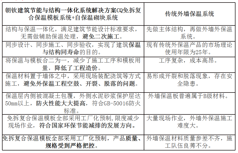 建筑外墻混凝土結構在澆筑時.外立面使用“CQ免拆復合模板”.使混凝土結構直接具備保溫性能;澆筑后該保溫模板及預埋錨固件與混凝土結構深度聯結、緊密結臺融力一體構,構筑于建筑主體之中.成為其永久、安全、環保的“保暖衣”。從根本上、一發性、永久性的解決了建筑外墻結構中混凝土“熱橋”部位的保溫問題。高性能自保溫節能砌塊”讓‘砌體結構’像骨髓一樣鑲嵌在主體結構中.并且自身具備滿足節能標準的保溫性能。它在外墻結構系統構成的同時。同步形成了外墻保溫系統,一次性具備了保溫節能功能,無需任何外墻保溫二次工程。因此“朝欽自保溫體系”可同時具備:節能、防火、省工、耐久、安全、經濟、低碳等獨有特點。