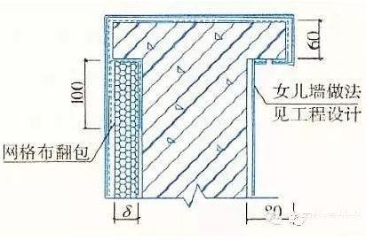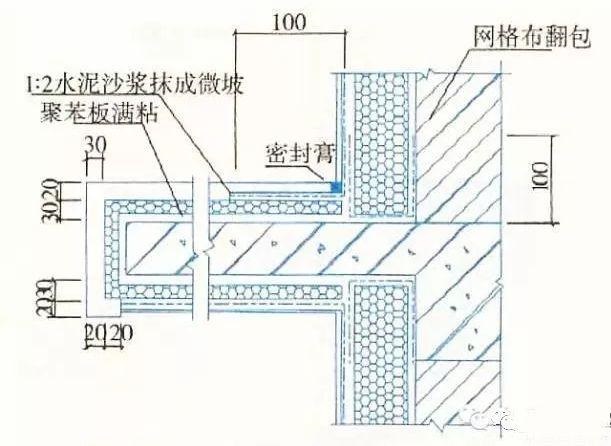 (2)裝飾縫、門窗四角等處應做局部加強網施工。陰陽角需從兩側雙向繞角且陽角搭接寬度不小于200mm,陰角搭接寬度不小于100mm。遇門窗口、通風口及與不同材質的接合處(配電箱、水管等),粘板前應先鋪設一道200mm寬的翻包網格布,應將增強網布翻邊包緊保溫板;洞口的四角應各貼一塊增強網布,并用聚合物砂漿將網布折疊部分抹平封嚴。