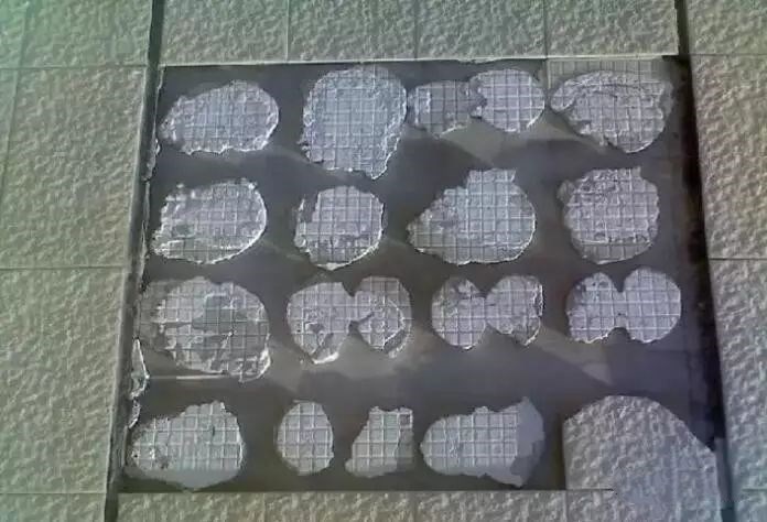 瓷磚脫落的破壞面常常發生在瓷磚膠~瓷磚界面(局部脫落),或瓷磚膠~粘結基面界面上(先發生較大面積空鼓)。