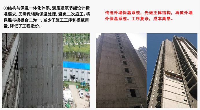 CQ免拆復合保溫模板與結構墻體一次澆筑成型,與外保溫系統相比,減少了二次保溫施工環節,縮短了施工周期。在有效降低人工成本的同時,也減少了材料的消耗,有效降低了建筑物的建造成本。